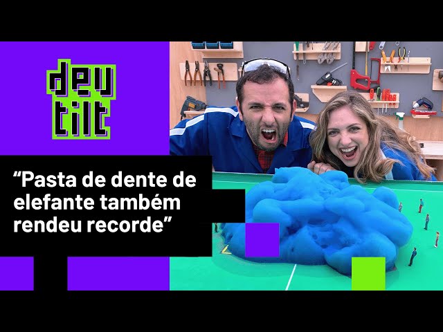 O segundo - e para Iberê, o mais trabalhoso - veio após a criação da maior pasta de dente de elefante do mundo. O experimento, que é uma mistura de água oxigenada, iodeto de potássio, sal e sabão, foi feito do tamanho de um campo de futebol, somando 273 metros cúbicos.