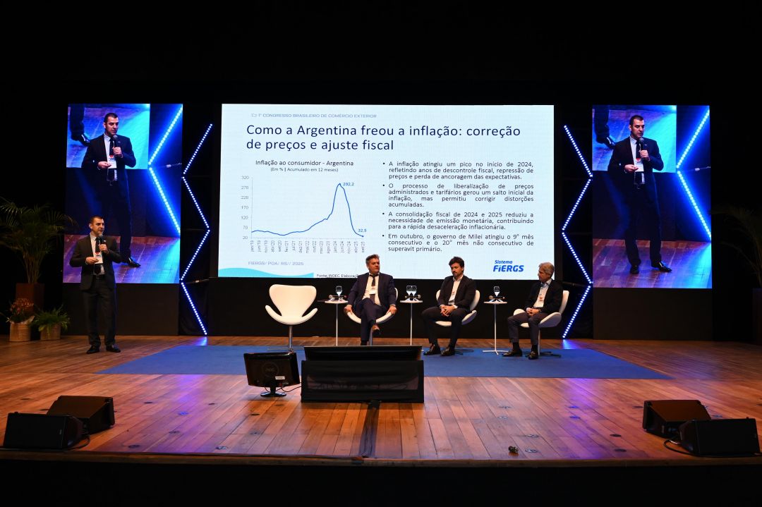 As reformas fiscais do governo Javier Milei na Argentina e a redução de burocracias para importações têm favorecido as exportações brasileiras, especialmente as gaúchas. A análise sobre o cenário econômico do país vizinho e as oportunidades para o Brasil ocorreu durante painel nesta quarta-feira (26), segundo dia do 1º Congresso Brasileiro de Comércio Exterior, promovido pelo Sistema Fiergs. De acordo com o economista-chefe do Sistema Fiergs, Giovani Baggio, as reformas estão favorecendo o aumento da produção industrial argentina, que depende de produtos brasileiros para sua cadeia produtiva – o que ajuda a explicar o crescimento de 48,7% nas exportações da indústria da transformação do Rio Grande do Sul para a Argentina entre janeiro e outubro de 2025, na comparação com o mesmo período de 2024. "Temos uma relação consolidada com a Argentina, mas as mudanças fiscais têm trazido resultados positivos", afirmou.